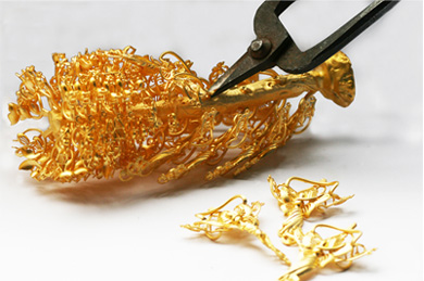 將澆鑄出來的產品進行修整稱之為執模。執模包括整形、修挫、過砂、焊接、組裝等,全部用手工方式進行。執模就是將澆鑄出來的黃金產品修整到和原版一樣,需要技能 水平較高的工人用嫻熟的手法制作。